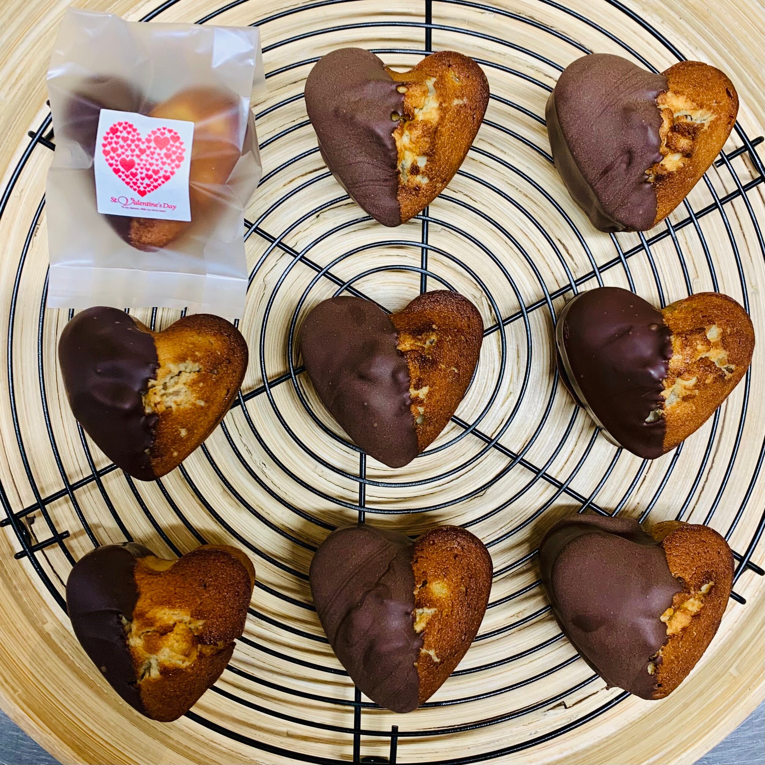 ホワイトデー限定でハート型に焼き上げ、チョコレートをコーティングしました!