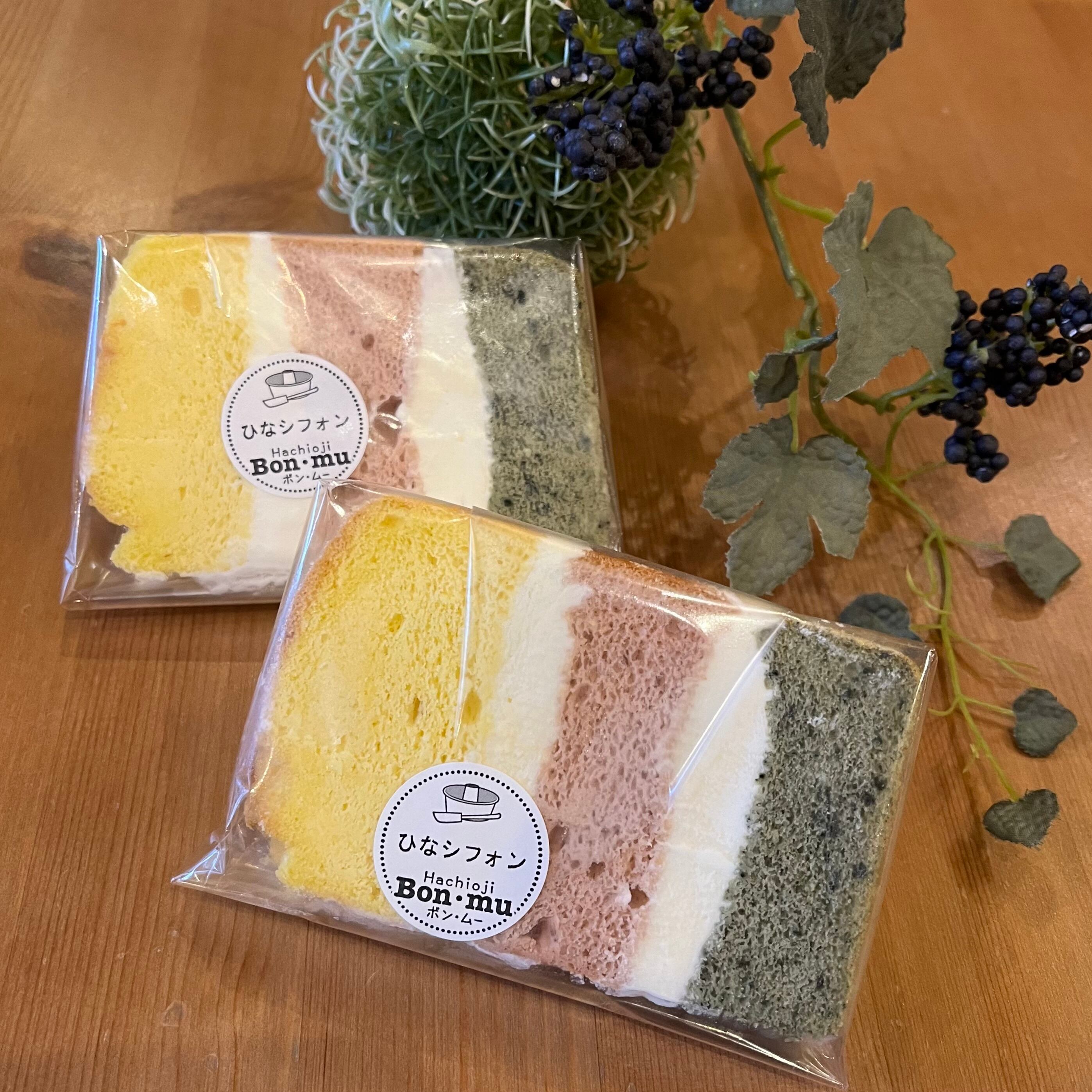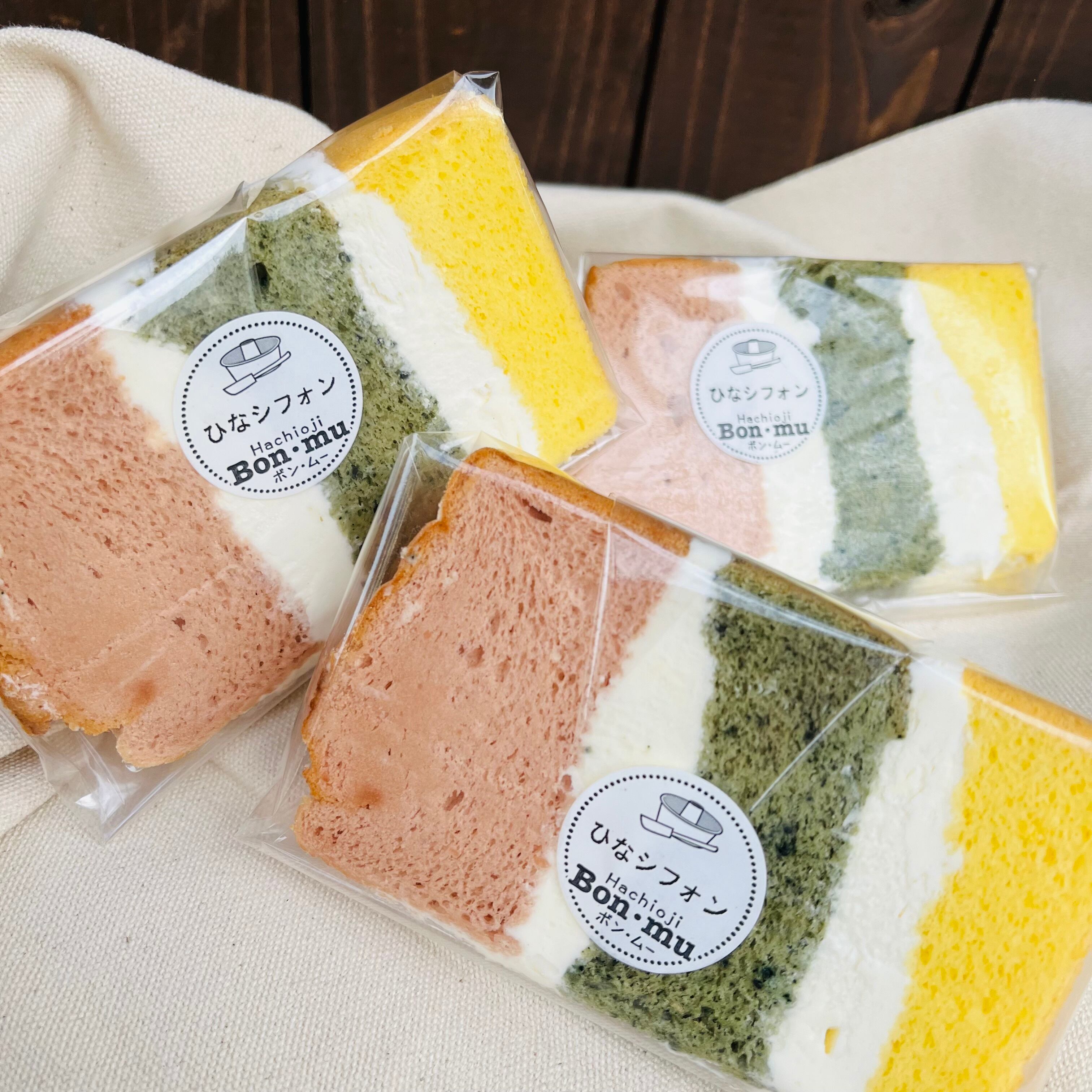 桃の節句にちなんだ3色のシフォンケーキを、ホイップクリームでサンドしました。